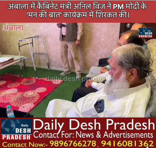 Home / Haryana / अंबाला: अनिल विज ने सुनी पीएम मोदी की ‘मन की बात’, जल संरक्षण और सौर ऊर्जा पर दिया जोर……AmbalaHaryanaअंबाला: अनिल विज ने सुनी पीएम मोदी की ‘मन की बात’, जल संरक्षण और सौर ऊर्जा पर दिया जोर……March 28, 2026 Click Here to See Video Share this ArticlePrevious Articleअंबाला से अयोध्या धाम के लिए तीर्थ यात्री ट्रेन रवाना, सीएम सैनी ने किया फ्लैग ऑफ……Next Articleअंबाला: 25 हजार एकड़ सूरजमुखी पर कटुआ सुंडी का हमला, कृषि विभाग ने जारी की एडवाईजरी……root Related Posts अंबाला: 25 हजार एकड़ सूरजमुखी पर कटुआ सुंडी का हमला, कृषि विभाग न ... March 29, 2026 अंबाला से अयोध्या धाम के लिए तीर्थ यात्री ट्रेन रवाना, सीएम सैनी ... March 27, 2026 अंबाला: अंबाला सांसद वरुण चौधरी पहुंचे स्वर्गीय अवतार सिंह के घर, ... March 26, 2026
