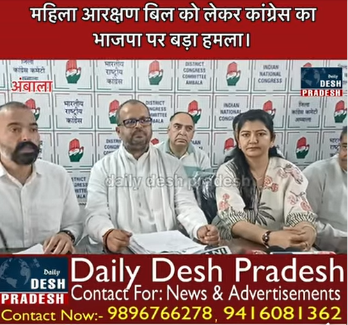 Home / Politics / कांग्रेस का आरोप: “महिला विरोधी है भाजपा, इसीलिए 2024 चुनाव में नहीं दिया आरक्षण।……..AmbalaHaryanaPoliticsकांग्रेस का आरोप: “महिला विरोधी है भाजपा, इसीलिए 2024 चुनाव में नहीं दिया आरक्षण।……..April 21, 2026 Click Here to See Video Share this ArticlePrevious Articleअंबाला: बढ़ने लगी आगज़नी की घटनाएं,दमकल कर्मी हड़ताल पर……..Next Articleअंबाला: प्रधानमंत्री नरेंद्र मोदी और हरियाणा के मुख्यमंत्री नायब सैनी की फोटो लगाकर विज्ञापन करना पड़ा महंगा, अंबाला की सोलर कंपनी पर FIR…….root Related Posts अंबाला: दमकलकर्मियों की हड़ताल से चरमराई व्यवस्था, होमगार्ड और रो ... April 22, 2026 अंबाला: क्या निजी बसों में मान्य होंगे फ्री पास …….?क्या परिवहन आ ... April 21, 2026 अंबाला: प्रधानमंत्री नरेंद्र मोदी और हरियाणा के मुख्यमंत्री नायब ... April 21, 2026